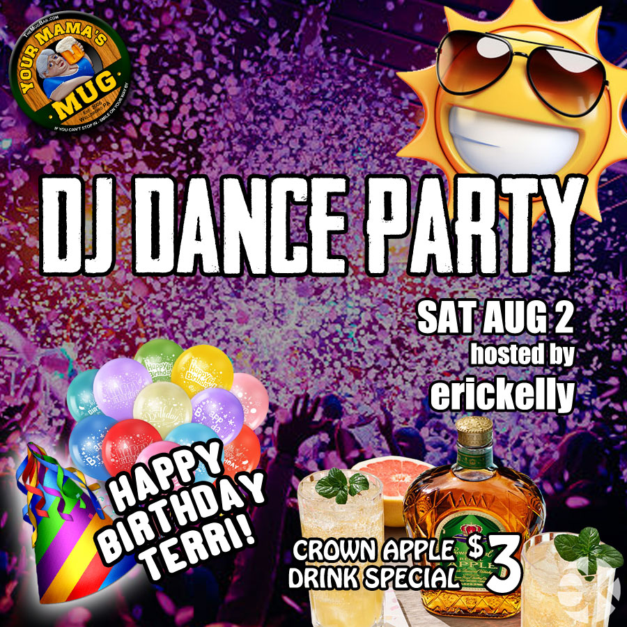 The Summer Parties continue this Saturday! We’re wishing Terri a Happy Birthday with all-request music by erickelly and a Crown Apple drink special for only three bucks! If you haven’t noticed, the kitchen is back – check out our menu!