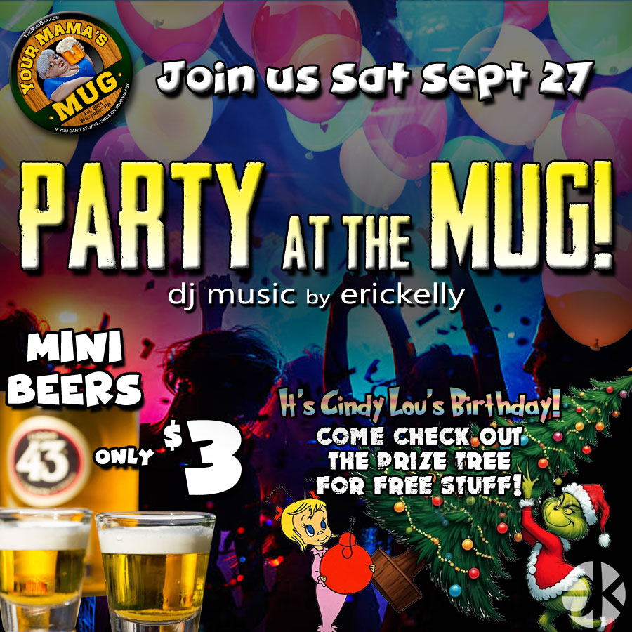 Come PARTY at The MUG this Saturday with erickelly! Mini Beers on SPECIAL for only three bucks!